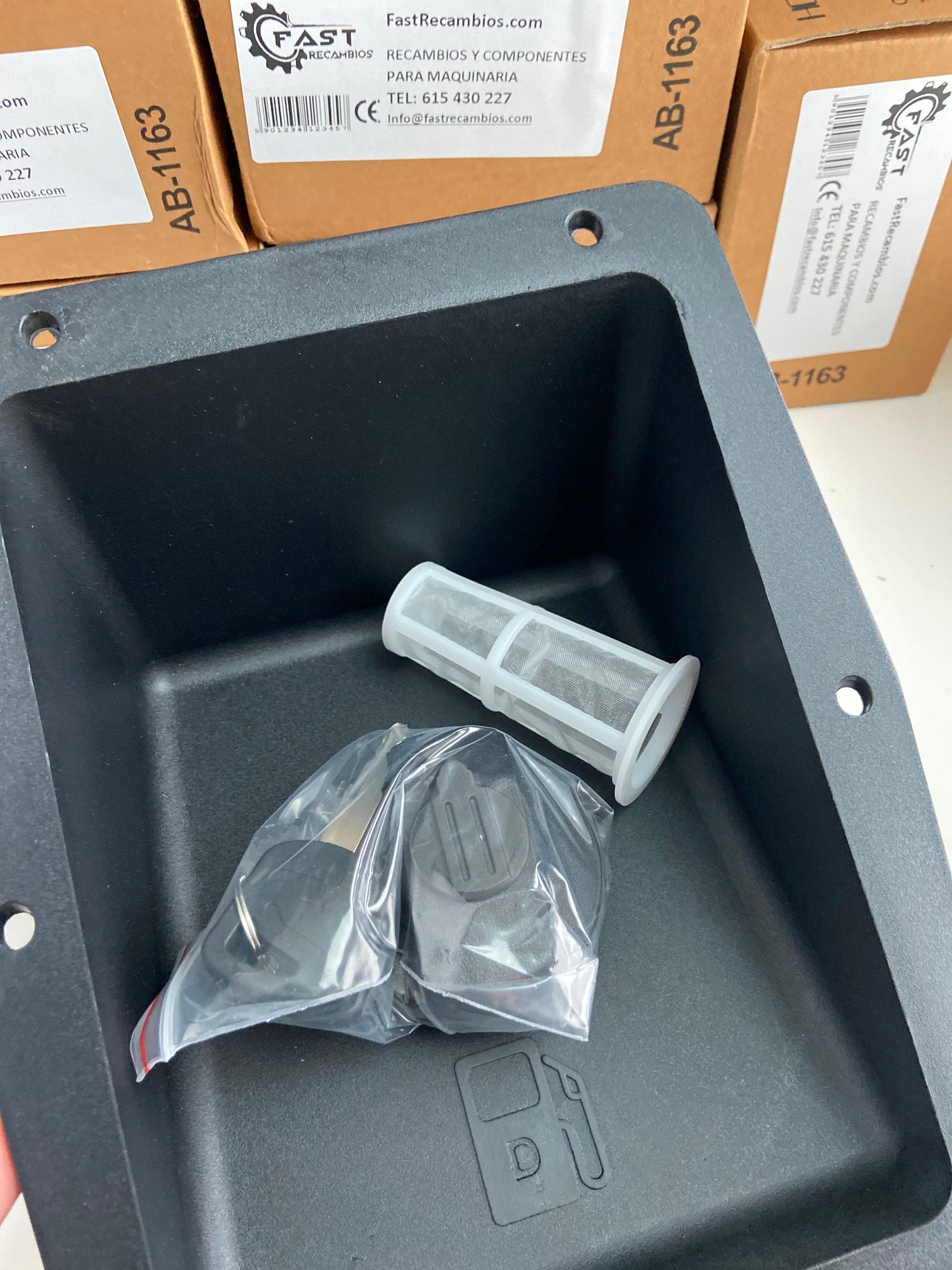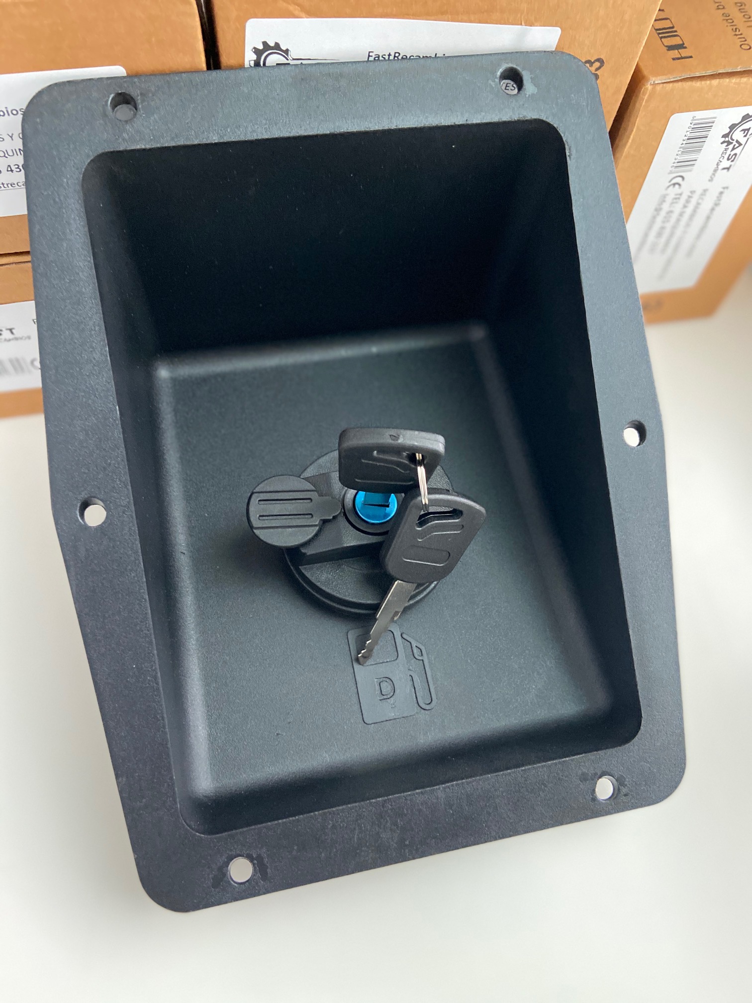 Embocadura plástica de llenado de combustible, lleva tapón con llave y filtro incorporados.